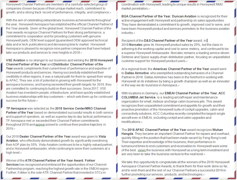 霍尼韋爾祝賀了所有獲得2018霍尼韋爾航空渠道合作伙伴獎(jiǎng)的公司,感謝他們的努力付出,也希望他們和其他的渠道合作伙伴一道能在2019年推廣霍尼韋爾的服務(wù)、產(chǎn)品和技術(shù)上取得成功。